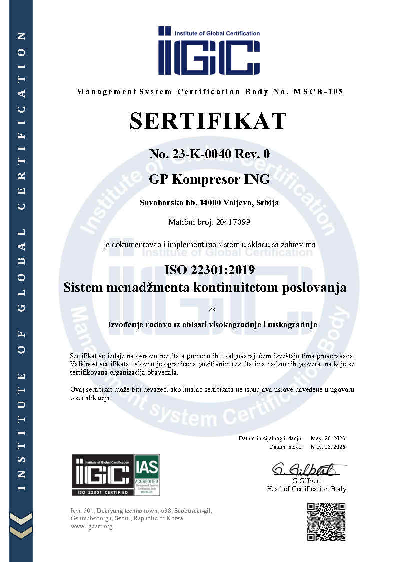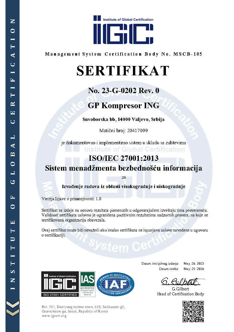 Od osnivanja 1999. godine u Valjevu, Kompresor ING se razvija kao pouzdan partner u realizaciji infrastrukturnih i građevinskih projekata. Kroz kontinuirano ulaganje u mehanizaciju, stručan tim i unapređenje poslovnih procesa, kompanija je iz porodične firme izrasla u stabilan i prepoznatljiv sistem u oblasti niskogradnje i visokogradnje. Danas, sa više od tri decenije iskustva, realizujemo projekte različite složenosti uz dosledno poštovanje rokova, tehničkih standarda i zahteva investitora.